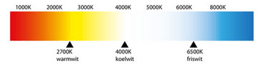 De kleurtemperatuur van verlichting wordt aangegeven in Kelvin. Hoe lager het getal, hoe warmer (geler) het licht is. Hoe hoger het getal, hoe kouder (witter) het licht is.